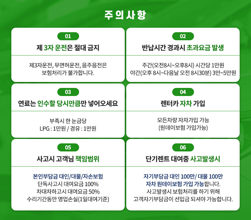 | 05 | 면허증을 제시하지 않거나 차종에 따른 대여자격 기준미달일 경우 대여가 취소될 수 있습니다. |