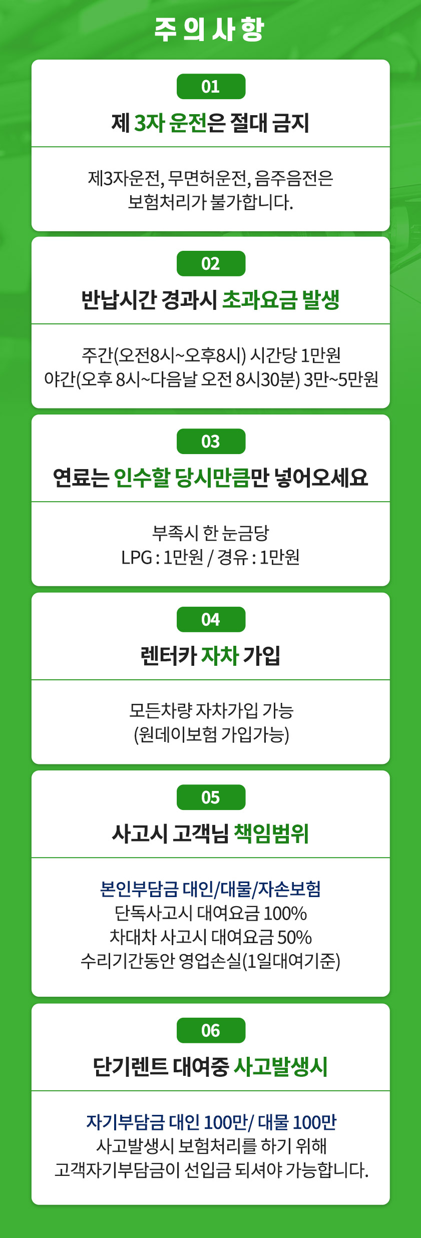 | 02 | 대여요금은 임차인 본인 또는 본인 소속의 신용카드가 결제원칙입니다. | |